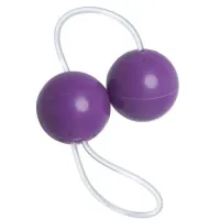Bolinhas feitas de plástico rígido com peso, utilizadas para a prática do pompoarismo, presas por um resistente cordão de nylon para facilitar o manuseio.
