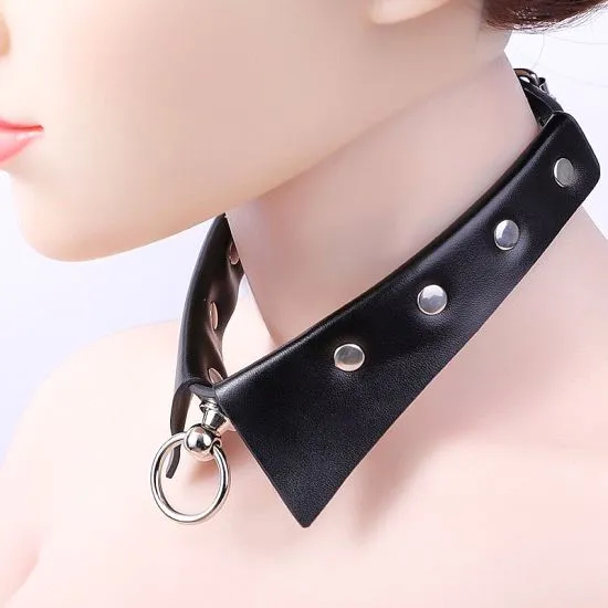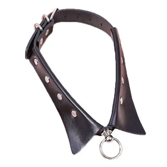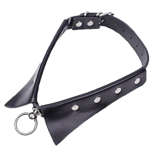Coleira bondage com guia em corrente ajustável por meio de fivelas metálicas, confeccionada em couro sintético, com parte interna confortável.