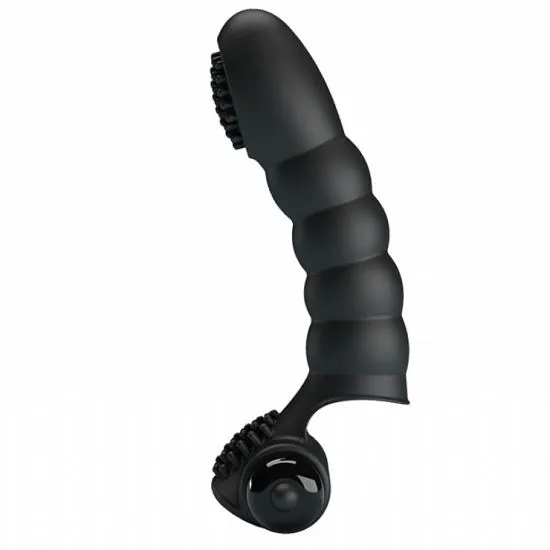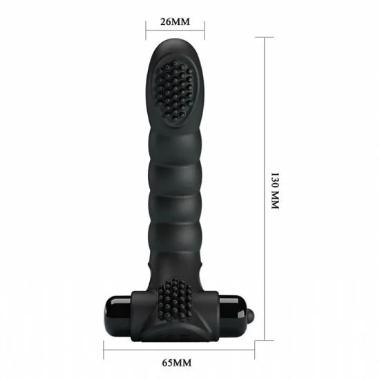 Dedeira em silicone com textura e cerdas estimuladores de clítoris e ponto G, com cápsula vibratória com 10 vibrações. A dedeira possui alças para o dedo, o que facilita o manuseio e a estimulação. Dimensões 13cm x 3cm, sendo 11cm Penetrável.